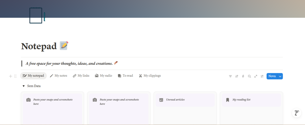 Página interativa para organizar notas, seus links (músicas, playlists, sites), lista de livros e artigos, além de espaço para fotos, imagens e prints. Tudo organizado em abas e data. Pra vc nunca mais perder uma ideia de vista!